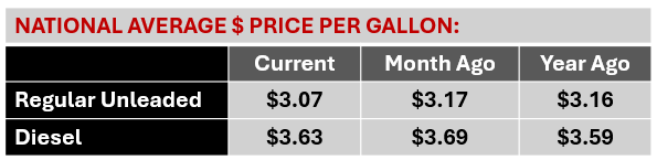 National Average Price for Regular Unleaded Current: $3.290; Month Ago: $3.380; Year Ago: $3.301. National Average Price for Diesel Current: $4.677; Month Ago: $5.058; Year Ago: $3.575.