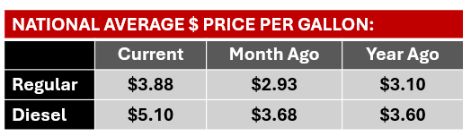 National Average Price for Regular Unleaded Current: $3.370; Month Ago: $3.403; Year Ago: $2.164. National Average Price for Diesel Current: $3.627; Month Ago: $3.636; Year Ago: $2.438.