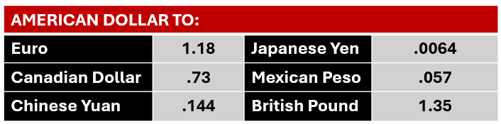 American Dollar to Canadian Dollar = 0.723793; American Dollar to Chinese Yuan = 0.138926; American Dollar to Euro = 0.971826; American Dollar to Japanese Yen = 0.006766; American Dollar to Mexican Peso = 0.049825.
