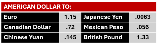 American Dollar to Canadian Dollar = 0.737189; American Dollar to Chinese Yuan = 0.141332; American Dollar to Euro = 1.122296; American Dollar to Japanese Yen = 0.009364; American Dollar to Mexican Peso = 0.044292.